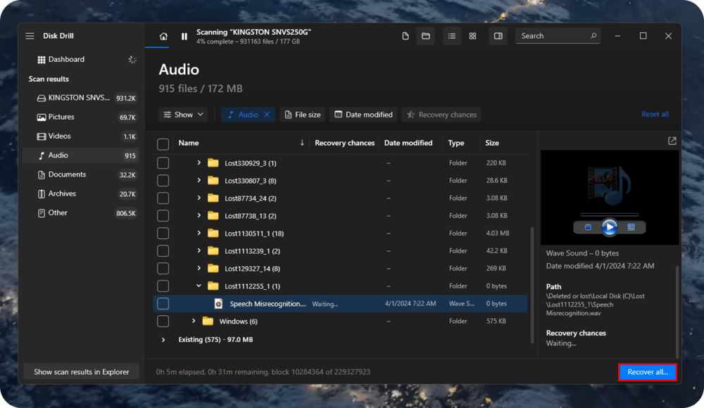 4. Review and select your tracks. Use the preview panel to confirm the right files. Next to each file, check the Recovery chances indicator, which shows the likelihood that the track is intact and can be restored without issues. You can also play the track directly in the preview. If the file name does not help, this is the best way to identify it.