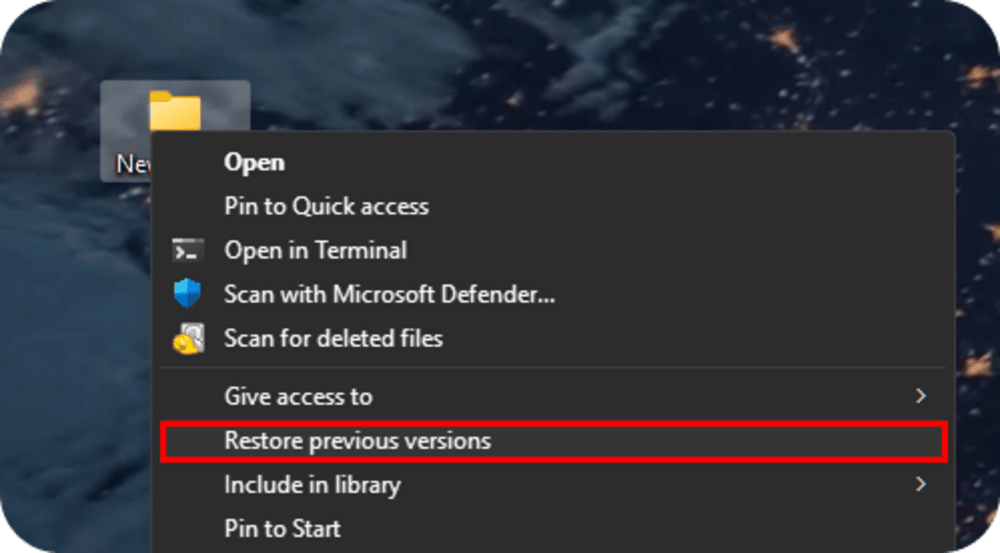 3. Click the History button in the toolbar, or right-click inside the folder and select Restore previous versions.